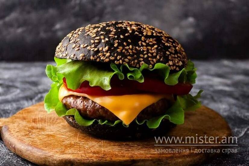 Беремо чорну булку, смажимо соковиту котлету, додаємо сир чедер, айсберг, маринований огірок, цибулю, томати, авторський соус.