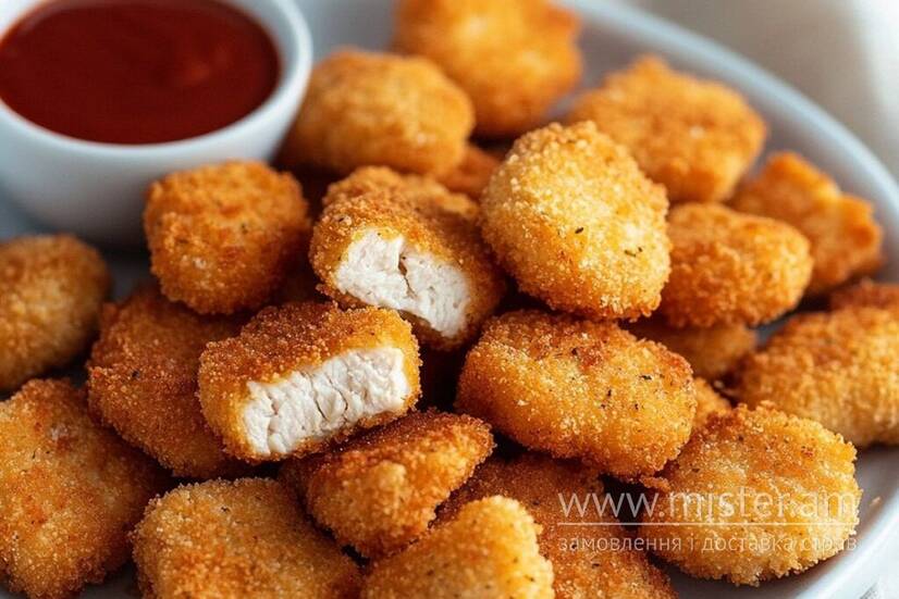 Соковиті шматочки курки у хрусткій золотистій паніровці. Ідеальна закуска або доповнення до основної страви.