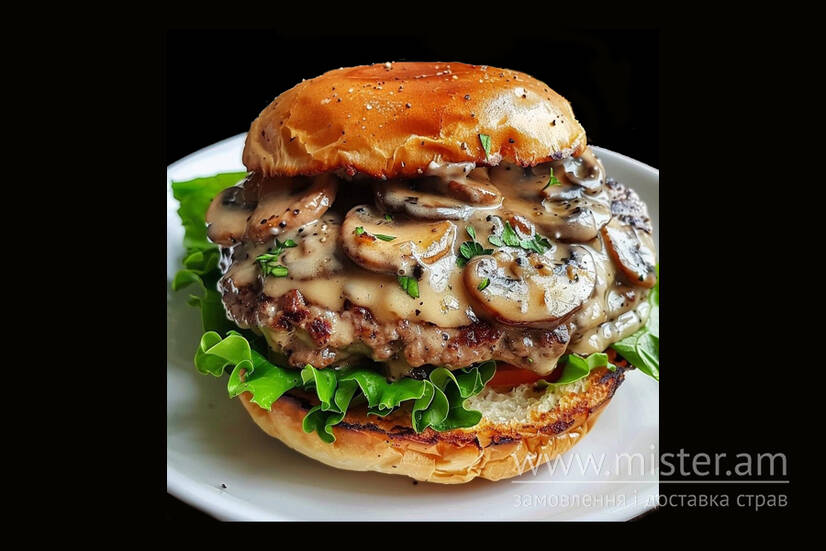 Соковита м`ясна котлета у булочці з овочами, доповнена ніжним грибним соусом. Ситний бургер з насиченим смаком.