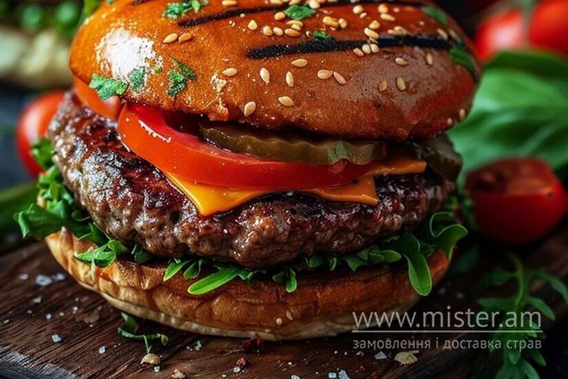 Соковита теляча котлета в рум`яній булочці з овочами та соусом. Смачний і поживний бургер з насиченим м`ясним смаком.
