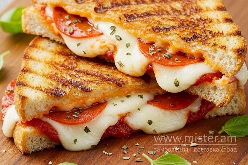 Тонкий хрусткий паніні з розтопленим сиром та соковитими помідорами. Легка та ароматна закуска з насиченим смаком.