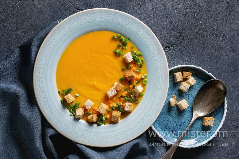 Ароматний та поживний крем-суп із сочевиці з ніжною текстурою. Подається з хрусткими сухариками, що ідеально доповнюють смак страви.