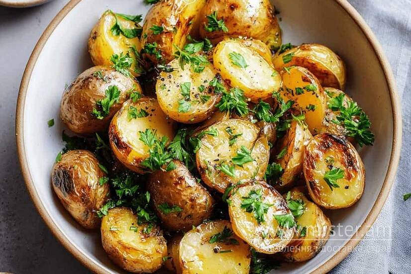 Апетитна картопля з рум’яною скоринкою, приправлена часником та свіжим кропом. Ситна й ароматна страва з домашнім смаком.