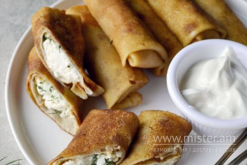 Ніжні тонкі млинці з домашнім сиром, подаються зі сметаною для ще більш ніжного смаку.