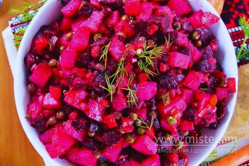 Класичний овочевий салат із буряком, картоплею, морквою, квашеною капустою та зеленим горошком, заправлений олією. Легка та яскрава традиційна страва.