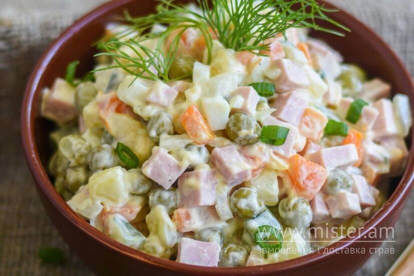 Традиційний салат з відвареною ковбасою, картоплею, морквою, яйцями та горошком, заправлений майонезом. Ситна та класична страва.