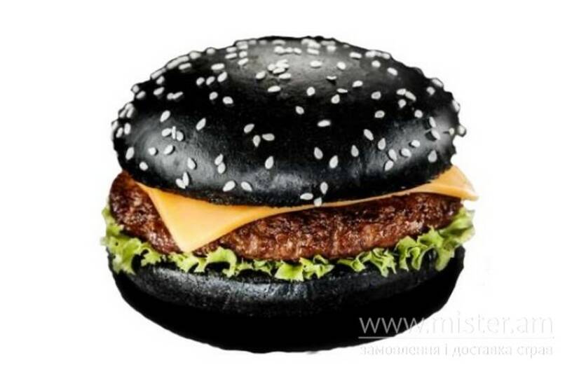 Чорна булочка з кунжутом, соковита котлета з яловичини, маринований огірок, цибуля, салат Айсберг, сир Чеддер, соус Тисяча островів.