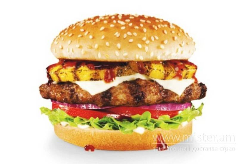 Пшенична булочка з кунжутом, ніжне куряче філе, помідор, цибуля, подвійний сир Чеддер, ананас, маринований огірок, салат Айсберг, сирний соус.