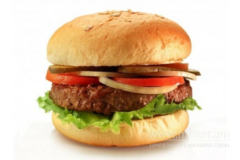 Пшенична булочка з кунжутом, соковита котлета з яловичини, цибуля, маринований огірок, салат Айсберг, гострий соус.