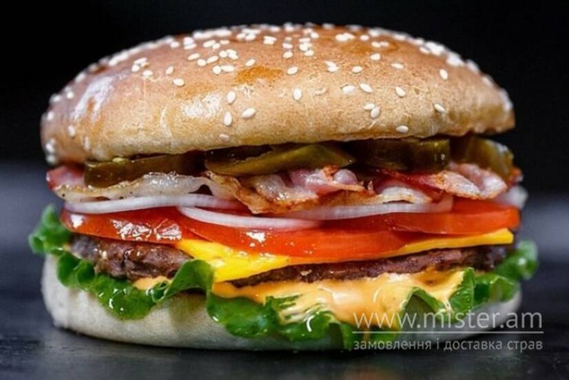 Булочка, соус цезар, рвана яловичина, подвійний сир Чеддер, айсберг, помідор, цибуля маринована, бекон смажений.