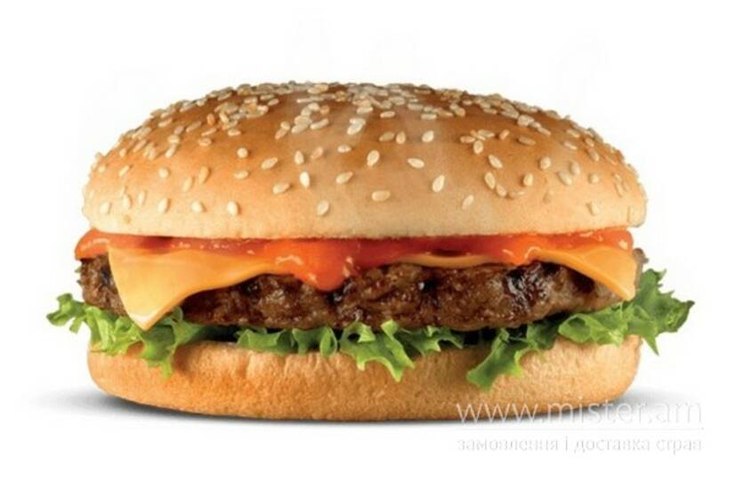 Пшенична булочка з кунжутом, соковита котлета з яловичини, маринований огірочок, цибуля, сир Чеддер, сирний соус.