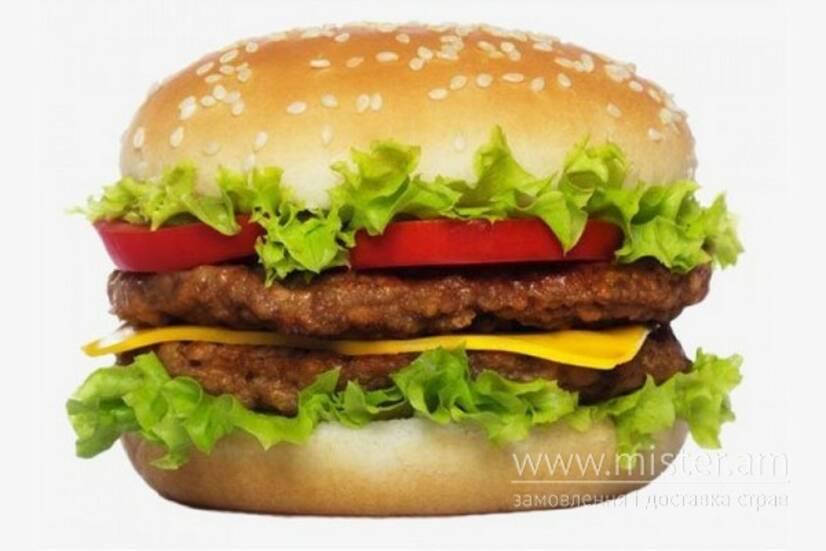 Пшенична булочка з кунжутом, подвійне куряче філе, гриби, маринований огірок, цибуля, подвійний сир Чеддер, салат айсберг, соус Тисяча островів, гірчичний соус.