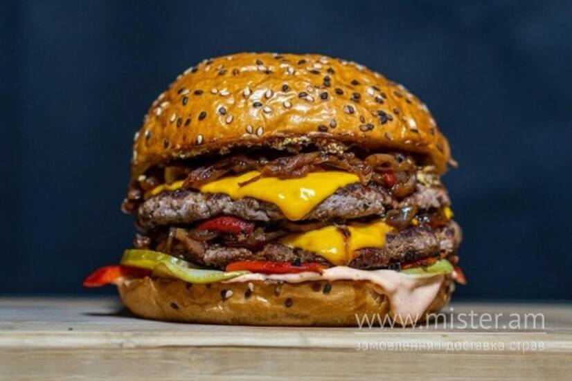 Булочка, котлета подвійна, подвійний сир Чедер, цибуля маринована, огірок маринований, айсберг, яйце смажене, бекон смажений, соус цезар, сирний соус, салат.