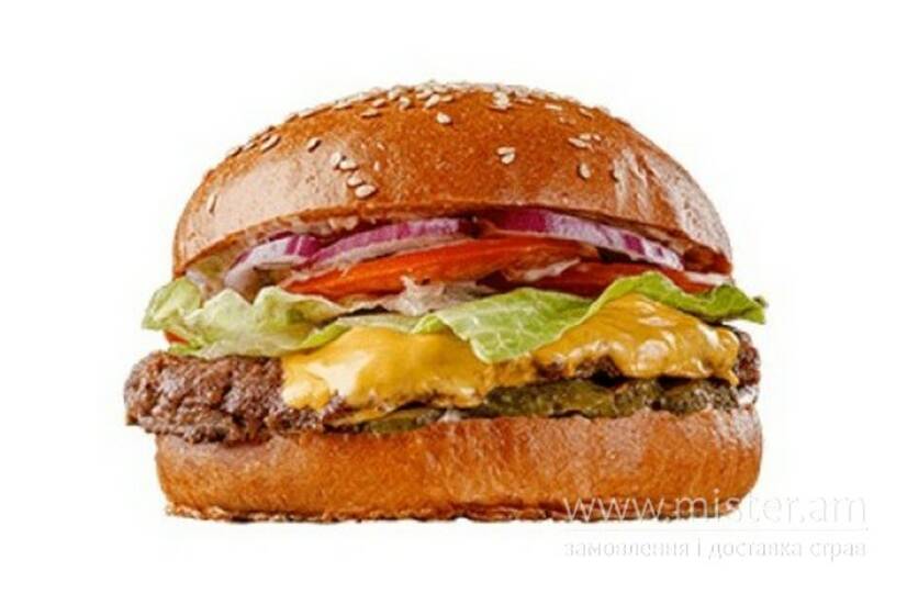 Пшенична булочка з кунжутом, соковита котлета з яловичини, помідор, петрушка, айсберг, пармезан, соус гострий, авторський соус.
