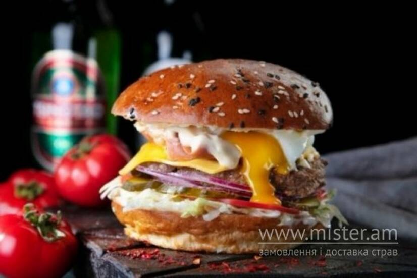 Булочка, соус Цезар, рвана яловичина, айсберг, яйце смажене, огірок маринований, бекон смажений, сир Чеддер,