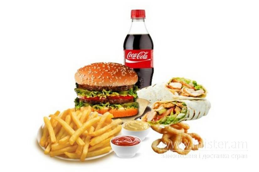 Бургер xxl, шаурма курка велика, картопля фрі велика, цибулеві кільця великі, 2 соуса кетчуп+ сирний, Кола 1 л.