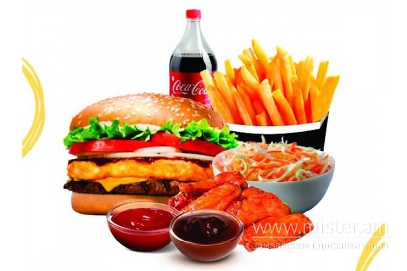 Крильця Buffalo 5 шт., картопля фрі ХХL, Кінг бургер, салат Коул слоу, кетчуп, барбекю, Кола 1 л.