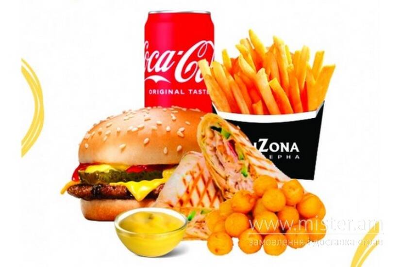 Чізбургер, Шаурма 4 сира, картопля фрі велика, картопляні кульки, соус сирний, Кола 0,33 л.