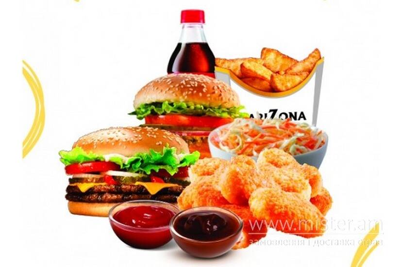 Мегабургер, Ориджинал бургер, картопля по-селянськи велика, нагетси ХХL, салат Коул слоу, соуси: барбекю, кетчуп, Кола 0,5 л.