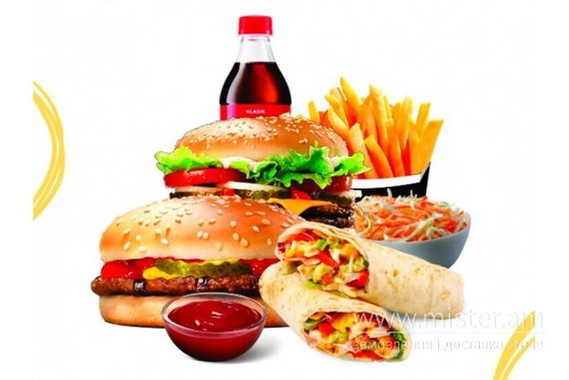 Гамбургер, Оріджинал бургер, шаурма селянська, картопля фрі стандарт, кетчуп, салат Коул слоу, Кола 0,5 л.
