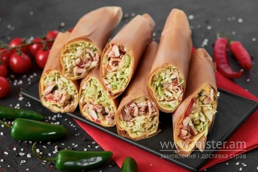 Шаурма куряча (стандарт) + телятина (стандарт), шаурма Жульєн, шаурма по-селянськи (стандарт), картопля фрі (велика), соус кетчуп, сирний, Кола 1 л.