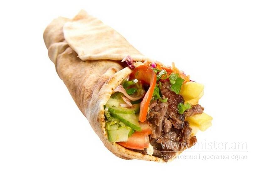 Хрумкий лаваш, подвійна порція м`яса, салат, сир, гриби, помідор, огірок, зелень, цибуля маринована, авторський соус.