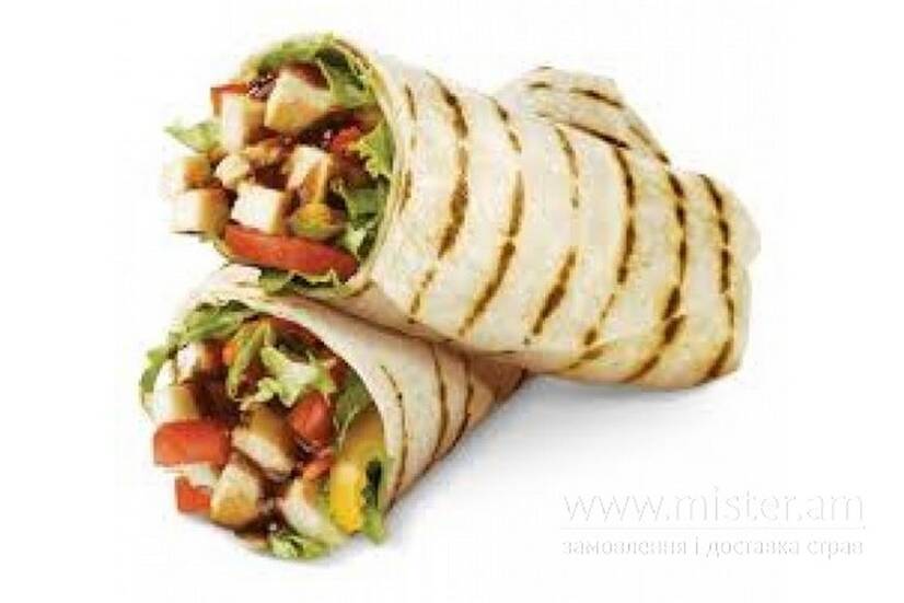 Курочка підсмажена у фритюрі, сир, маринована цибуля, морква корейська, помідор, зелень, авторський соус, гострий соус.