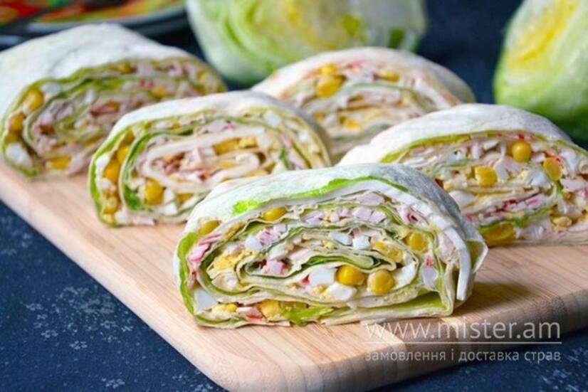 Лаваш, крабові палички, яйце варене, огірок, кукурудза, цибуля, майонез.