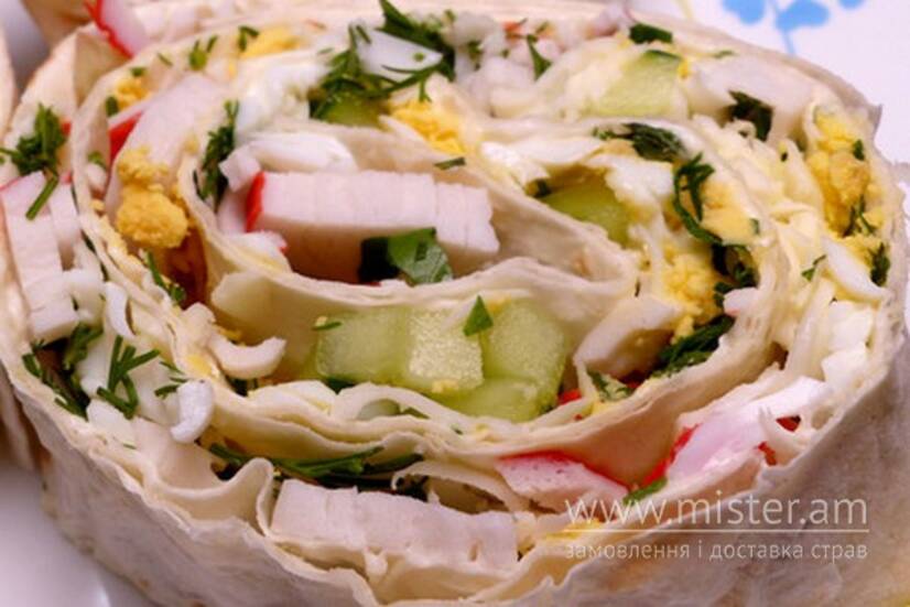 Лаваш, крабові палички, яйце варене, сир, огірок, майонез.