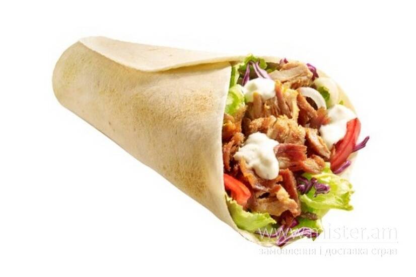 Хрумкий лаваш, салат з капусти та моркви, цибуля маринована, телятина, картопля фрі, огірок, помідор, зелень, соус Цезар, гострий соус.