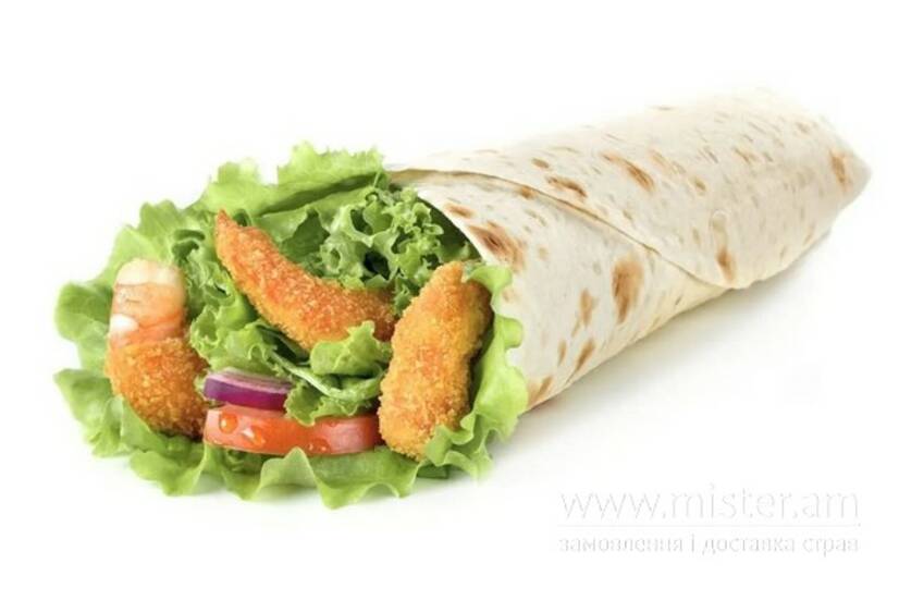 Лаваш, креветки в темпурі, крем-сир, огірок маринований, помідор, салат Айсберг, пармезан, соус Чеддер.
