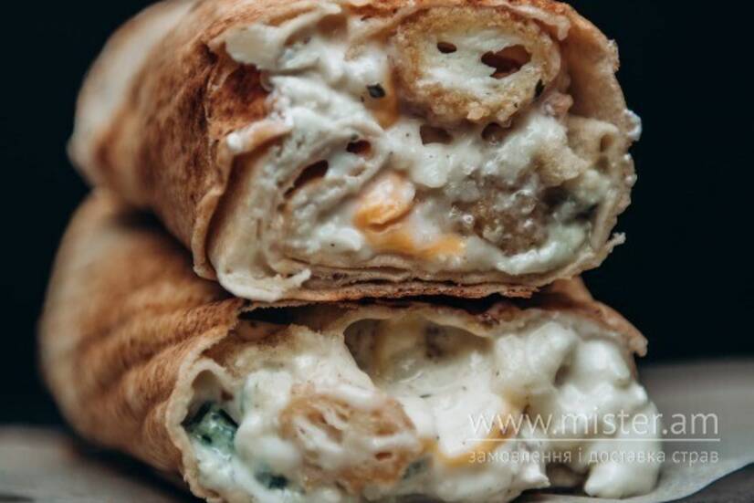 Лаваш, сир Моцарелла, сир Дор блю, груша, пармезан, салат Айсберг, соус Чеддер.