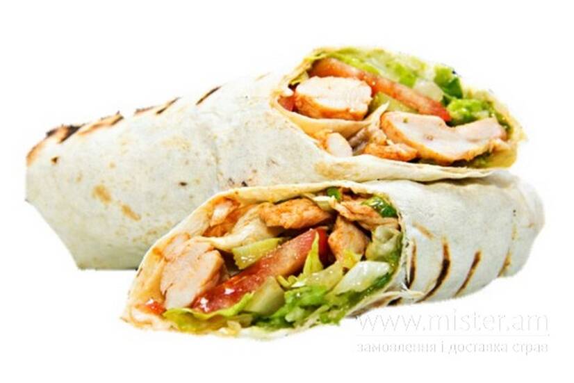 Хрумкий лаваш, салат з капусти та моркви, соковите куряче філе, огірок, помідор, авторський соус.