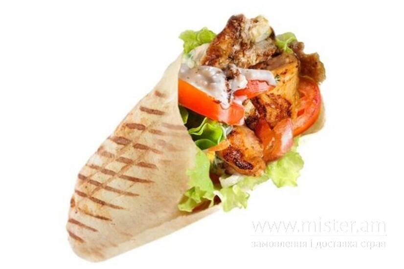 Хрумкий лаваш, салат з капусти та моркви, смачна смажена телятина, огірок, помідор, авторський соус.