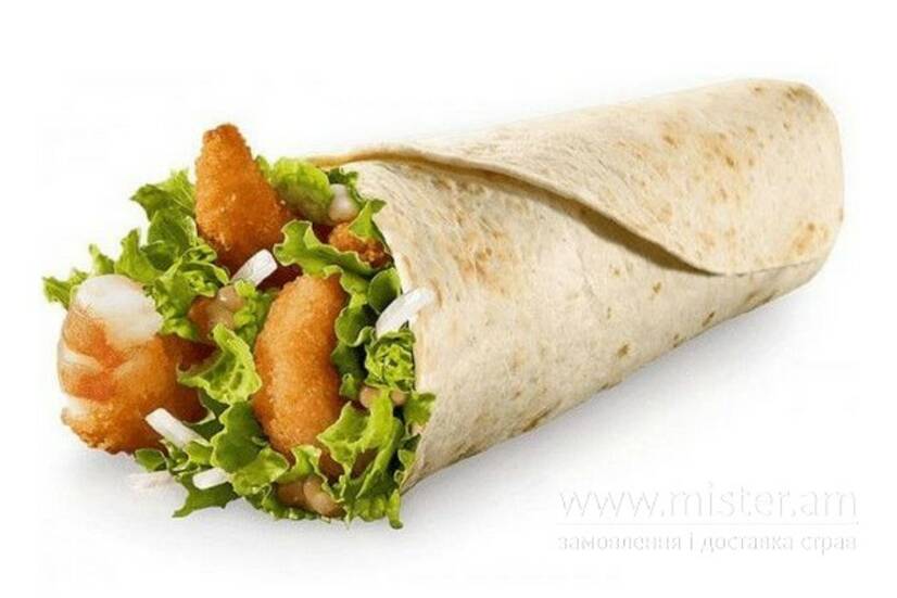 Лаваш, креветки в темпурі, салат Айсберг, помідори, соус Чеддер.