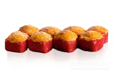 Лосось, авокадо, норі, вершковий сир, рис, ікра масаго, спайсі соус.