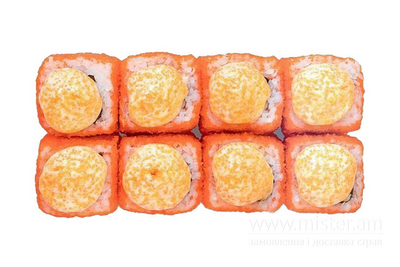 Рис, крабовий салат, авокадо, вершковий сир, ікра масаго, моцарелла.