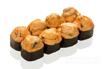 Рис, мідії, вершковий сир, японський омлет, соус спайсі.