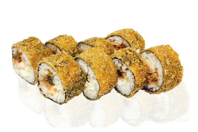 Рис, курка копчена, часниковий соус, огірок, цибуля зелена, темпура, сухарі панко.