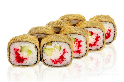 Рис, ікра масаго, краб сніжний, огірки, авокадо, сухарі панко.