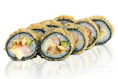 Рис, креветки, омлет томаго, вершковий сир, ікра масаго, темпура, сухарі панко, унагі соус.