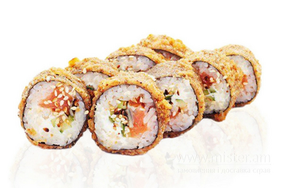 Рис, соус Спайс, креветки, лосось, вугор, сухарі панко.