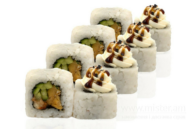 Рис, вугор, омлет томаго, огірок, сир вершковий, кунжут білий, соус унагі.