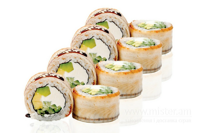 Рис, вугор, огірок, вершковий сир, авокадо, соус Унагі, кунжут білий.