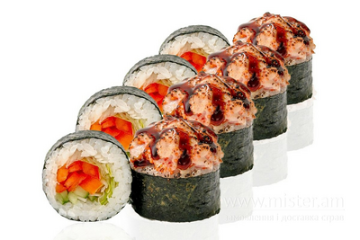 Рис, огірок, салат айсберг, вершковий сир, лосось майонез, ікра летючої риби, соус Теріякі.