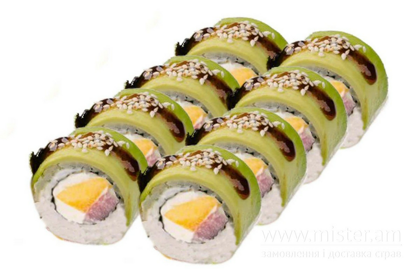Рис, вершковий сир, манго, лосось, авокадо, унагі соус, соус спайсі, кунжут.