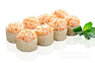 Рис, норі, вершковий сир, білий кунжут, огірок, креветки, спайсі соус.