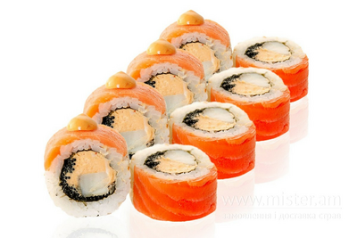 Рис, копчений лосось, креветка, вершковий сир, ікра летючої риби, соус спайсі, кунжут.