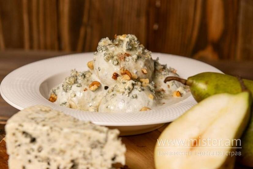 Французький акцент. Пухка галушка з начинкою з карамелізованої груші, під ніжним вершковим соусом дор блю. Подається з сиром дор блю, горіхами та медом. Баланс солодкого і солоного в елегантному французькому стилі.