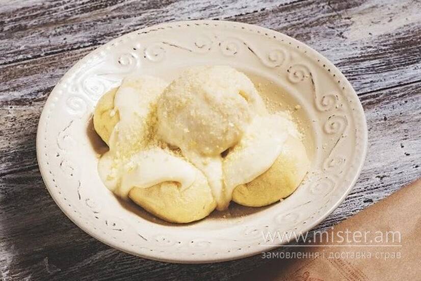 Парова галушка з сиром сулугуні та твердим сиром під ніжним вершково-сирним соусом, приправлена пармезаном.